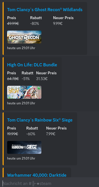 Als Mitglied fände ich das sehr cool, wenn der Bot uns einmal am Tag über Steam Sonderangebote Informiert.